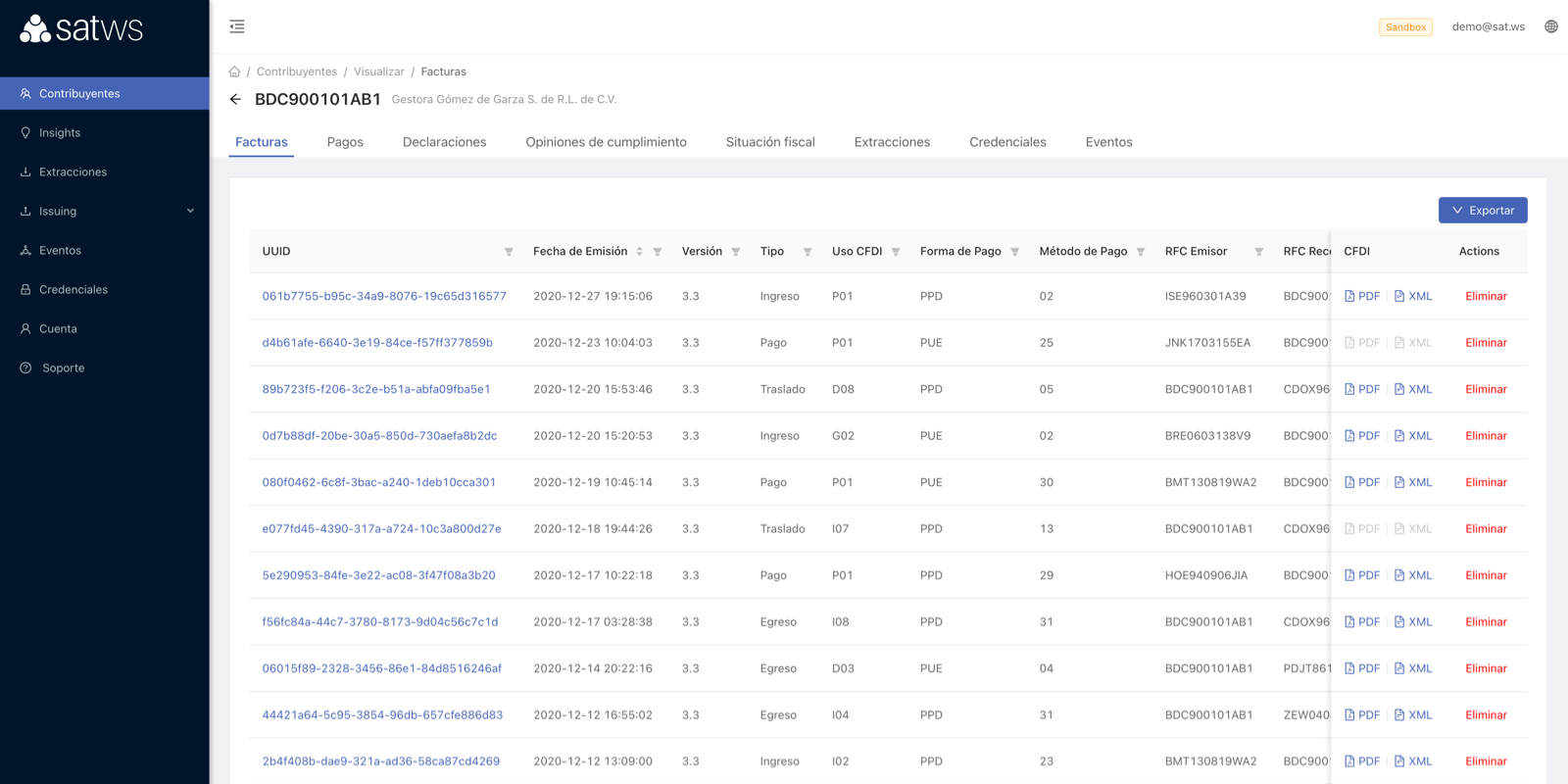 Facturas emitidas y recibidas, con su metadata y CFDI (XML y PDF)