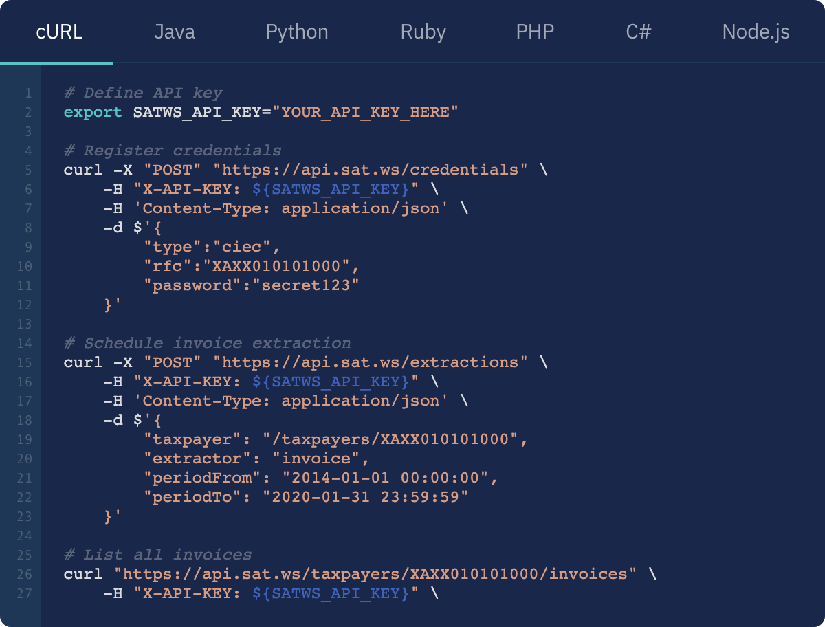 Conéctate a nuestras APIs para obtener, en minutos, acceso a todos los datos fiscales de tus clientes directamente desde el Servicio de Administración Tributaria (SAT).